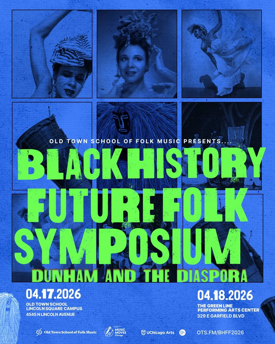 The 3rd Annual Black History Future Folk Symposium returns April 17–18, 2026 here in Chicago! Your 2-day ticket to this event will take place at both Old Town School of Folk Music and at Arts + Public Life Green Line Performing Arts Center. Details below: